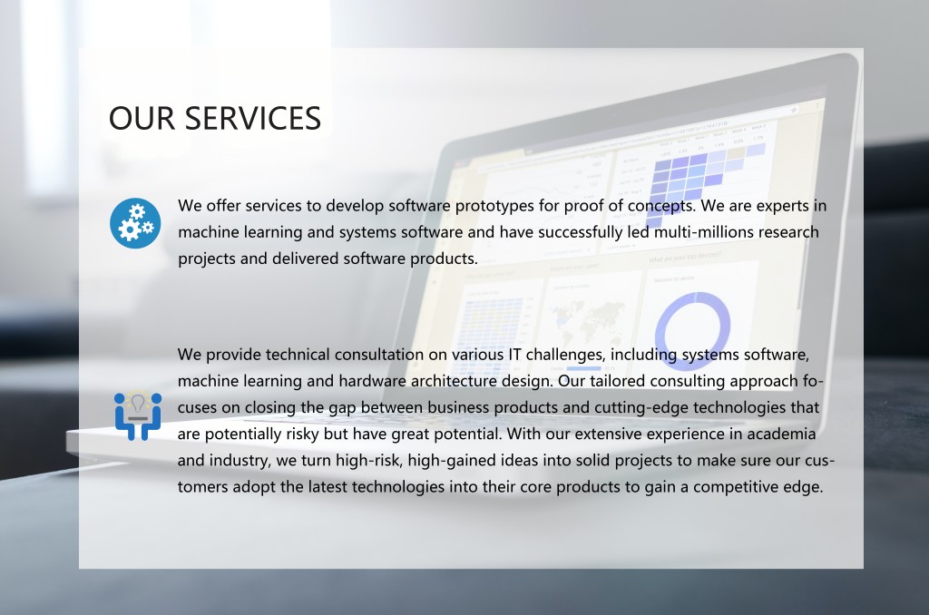 Based in the UK, we are a start-up specialising in cutting-edge IT R&D solutions. Our founding members have backgrounds in academia and industry, with considerable experience in leading R&D projects in the IT sector.